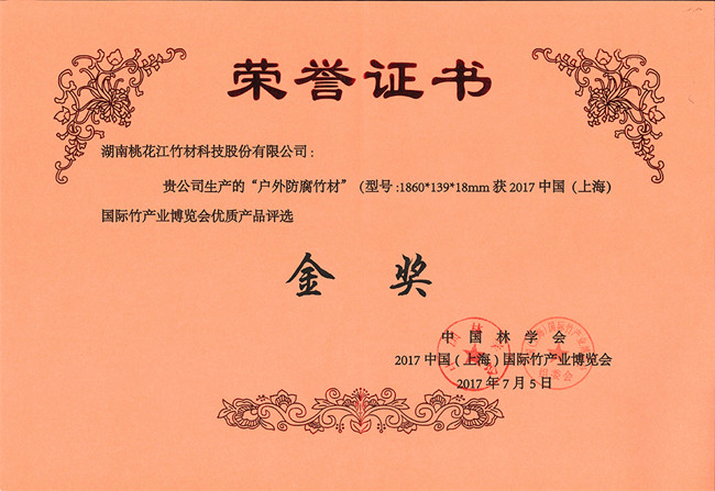 湖南桃花江竹材科技股份有限公司生產(chǎn)的戶外防腐竹地板在2017年7月中國(guó)(上海)國(guó)際竹產(chǎn)業(yè)博覽會(huì)中榮獲金獎(jiǎng),該獎(jiǎng)項(xiàng)由中國(guó)林學(xué)會(huì)、中國(guó)(上海)國(guó)際竹產(chǎn)業(yè)博覽會(huì)頒發(fā)。湖南桃花江竹材科技作為中國(guó)竹材領(lǐng)域高炭防腐技術(shù)的發(fā)明人,在中國(guó)竹材領(lǐng)域有著舉足輕重的地位。湖南桃花江竹材科技一直專注與于竹材的戶外運(yùn)用研發(fā)與創(chuàng)新,為全球客戶提供高品質(zhì)竹材。