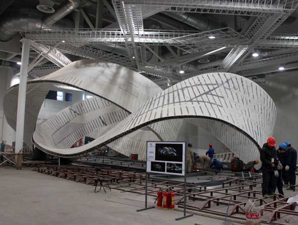 世博會(huì)湖南館取名為“桃花源里·Xanadu”;,Xanadu英文意為“世外桃源”,是西方世界描述神秘仙境為廣泛使用的詞匯。湖南館展示的主題則是“都市桃花源”。展館外觀之所以采用雙“魔比思環(huán)”相扣的造型,是因取義無(wú)窮大符號(hào)“∞”和中國(guó)太極,這與和諧自然的中國(guó)理想城市意境以及長(zhǎng)株潭城市群“兩型社會(huì)”的理念相契合。