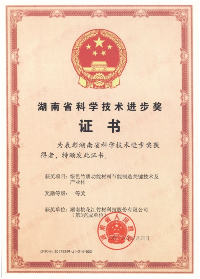 其中, 湖南桃花江竹材科技股份有限公司的綠色竹質功能材料節(jié)能制造關鍵技術及產業(yè)化項目榮獲2017年湖南省科學技術進步一等獎。